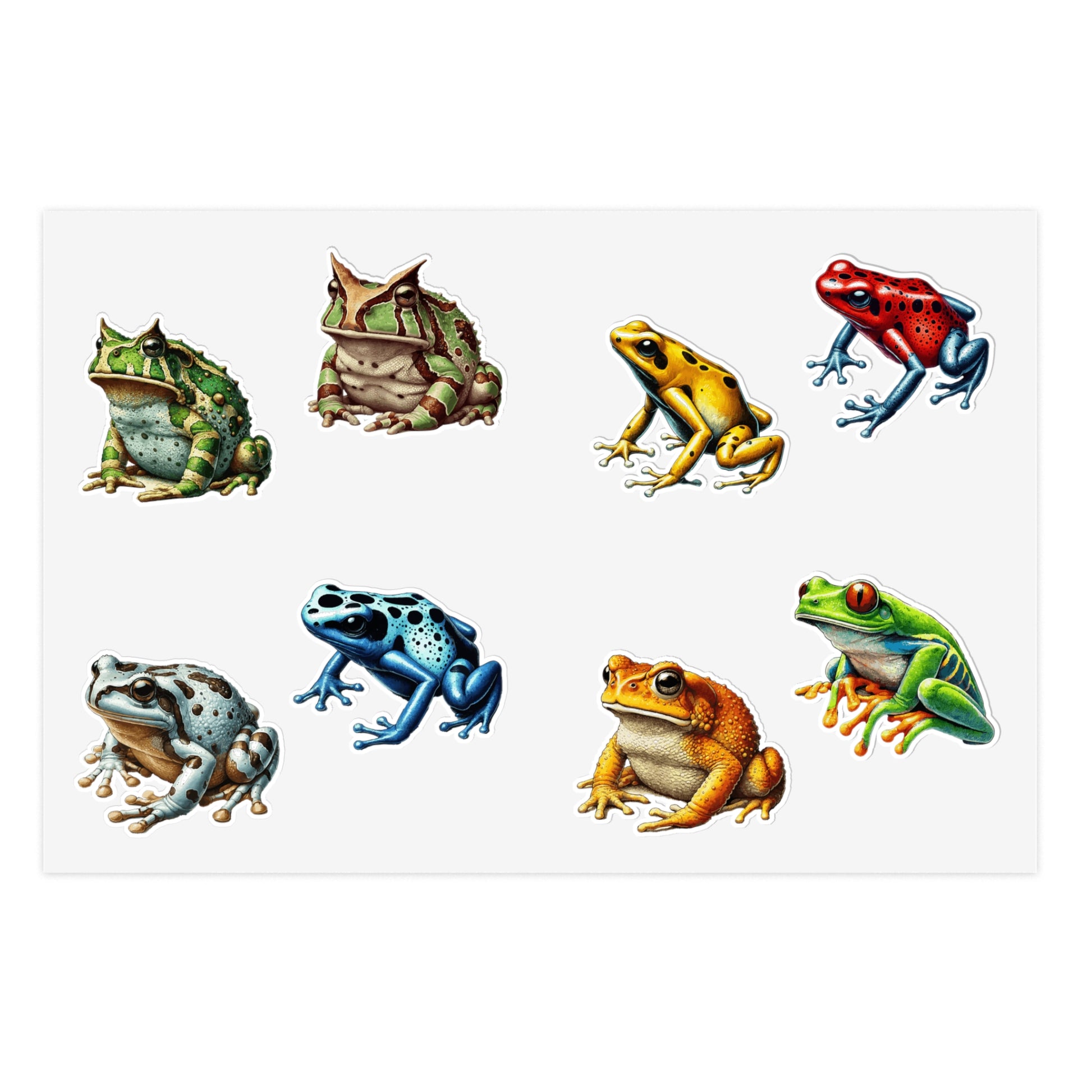 Celebrate the beauty of frogs with this sticker sheet featuring 8 unique amphibian designs, including the vibrant golden poison dart frog (Phyllobates terribilis) and the bold Amazon milk frog (Trachycephalus resinifictrix). Available in two sizes—large full sheets or small half sheets—these permanent vinyl stickers are perfect for notebooks, classroom decor, or quirky gift wrap. Made from high-quality, durable vinyl, these sticker sheets are ideal for frog lovers, biology nerds, and National Frog Day celebrations. Choose the 5-sheet bundle for even more amphibian fun!
